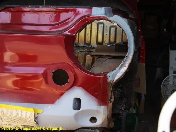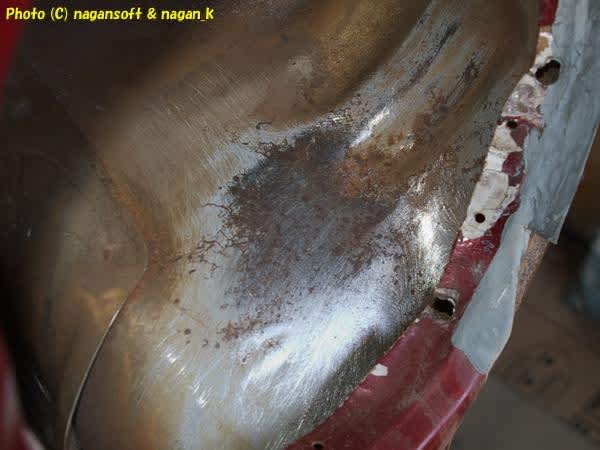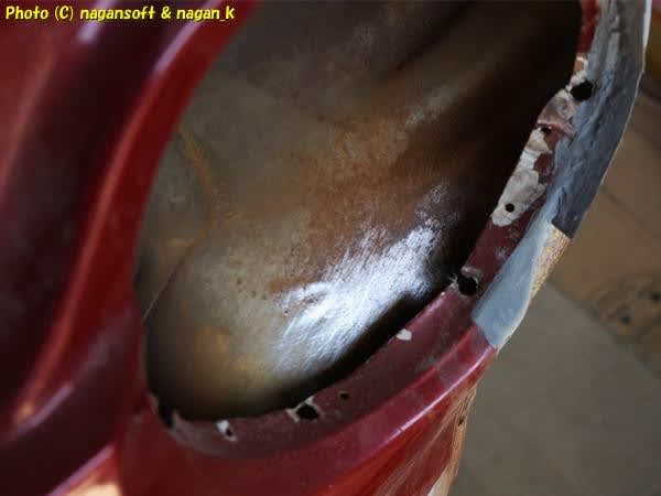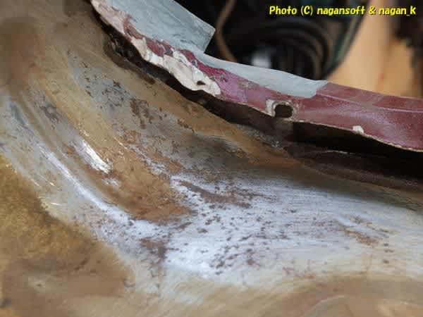うーん。トランク内側のフェンダーエプロンがどうもあやしい感じなんだよなー。ってサンドペーパーをシコシコとしてみる。