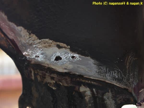 左ヘッドライト下のフェンダーエプロンとフロントパネル合わせ部分です。錆を削ったら穴開いたんだよね。