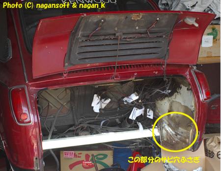 前日に発見した、エンジンルーム右側面のサビ穴ふさぎ作業です。