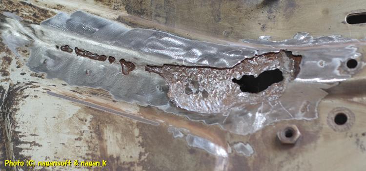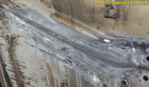 これで大穴はふさがりました。次はエンジンルーム右側面上のほうのサビ穴を攻めることにしよう。