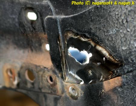 フェンダー側の鉄板も大穴が開いたので、鉄板をチョキチョキします。