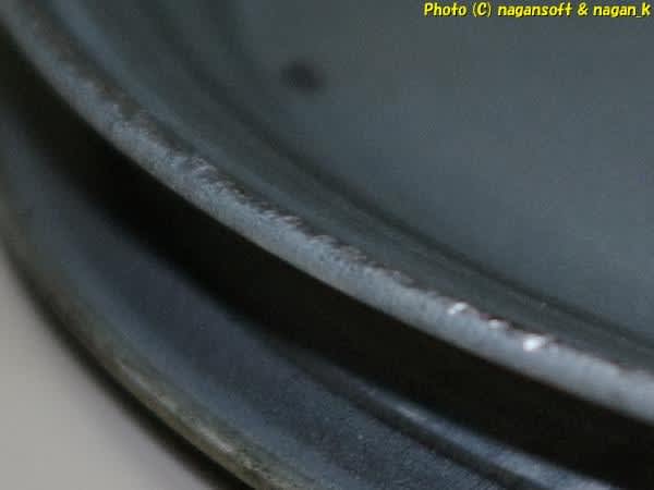 プーリーが重力に引っ張られて下に落ちていくと、プーリーの上になる縁がベルトにこすられてということです。なのでベルトも片側の角だけ摩耗あり。