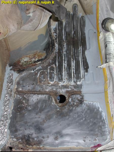 前回の続きで助手席床部分です。水研ぎで錆び研磨を続けて行います。