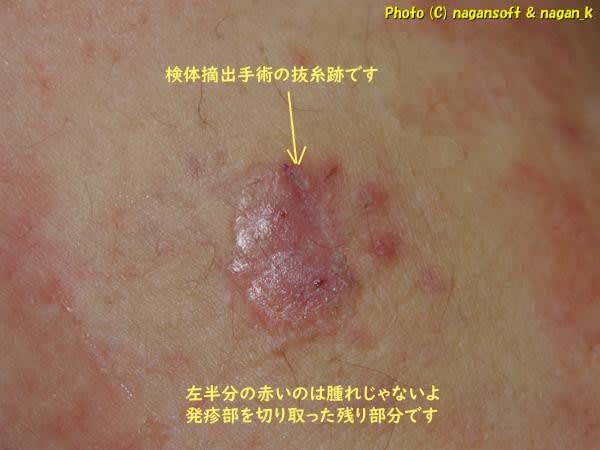 赤い発疹部分を真ん中で切断摘出しているので半分が残っています。