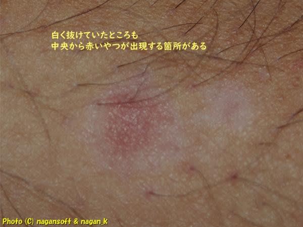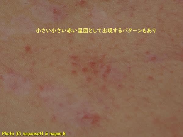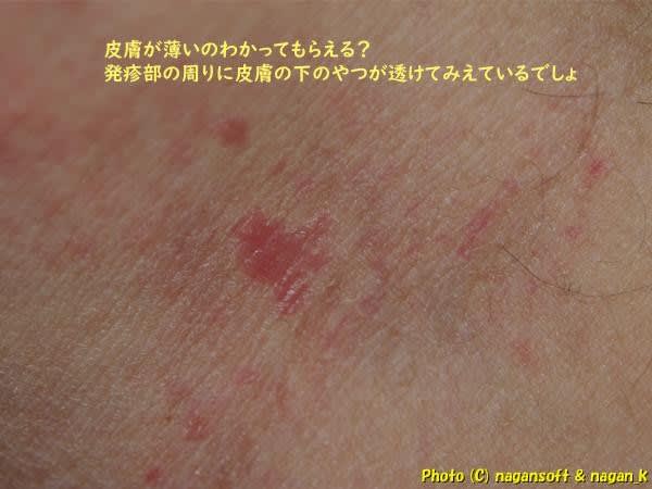 皮膚が薄いってのは次の写真でわかってもらえますか?発疹部の周りに皮膚の下の赤い予備軍のようなやつが透けて見えているんよ。