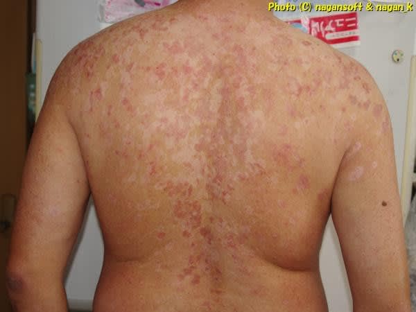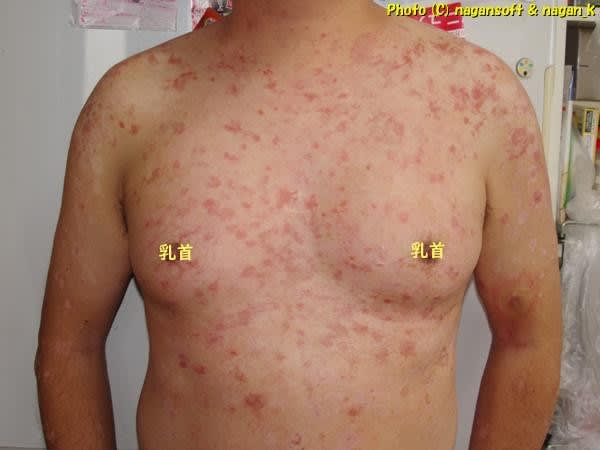 「ちゃうちゃう。地元の皮膚医院で乾癬って言われて免疫抑制剤出されてん。あげくにXX病院へ捨てられてさー、薬疹疑いかけられて犯人捜索中やでー」