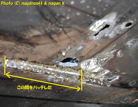 このパッチ鉄板を、フロアセンタートンネル袋部分に開いたサビ穴に、車体裏からアルミテープで借り止めします。