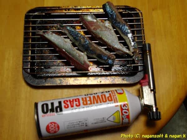 スバル弄りで錆固着したボルトをしばくときに用いているバーナーを持ち出しまして、鯖を炙ります。