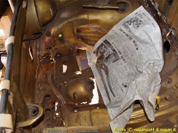 R-2君、トランク床右前角をめくる2日目、スバル弄りの先生がご来基地
