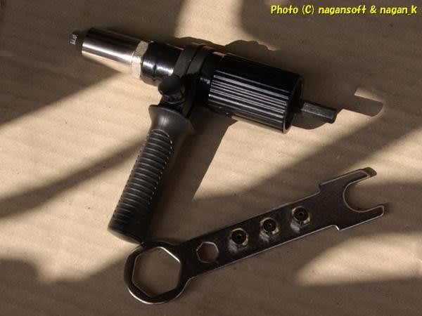 ドリルリベッタがすぐに使えなくなったので、4mmの両手打ちハンドリベッターと3mmの片手打ちハンドリベッターの2丁使いです。