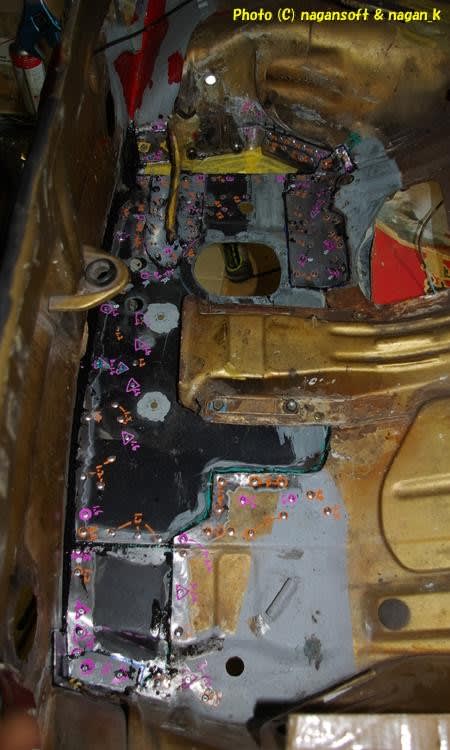 とりあえずトランク床鉄板の主要箇所だけタッピングボルトで締め上げて位置決めと部分密着させます。