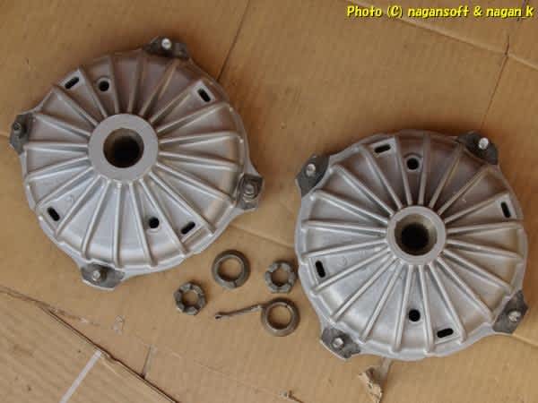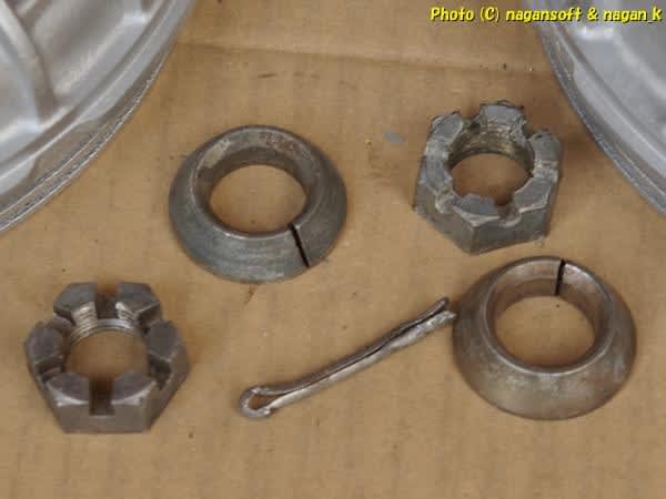 この、キャッスルナットとセンターピースを、クラウンワゴンの前輪部品が流用できないかと考えていたのですが…