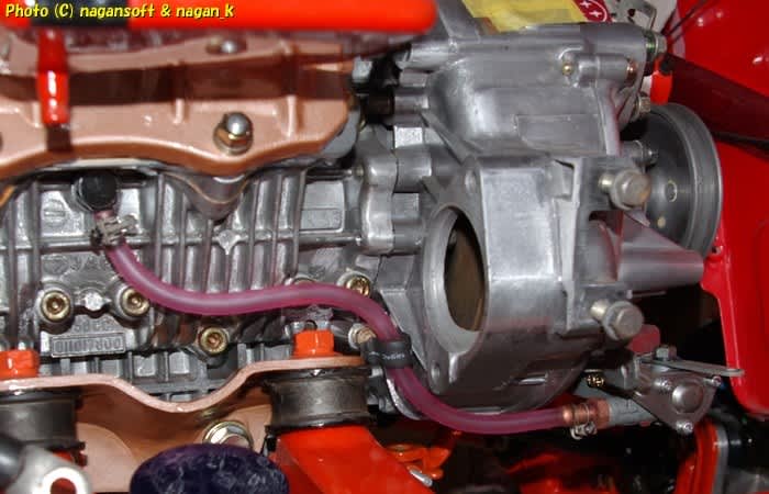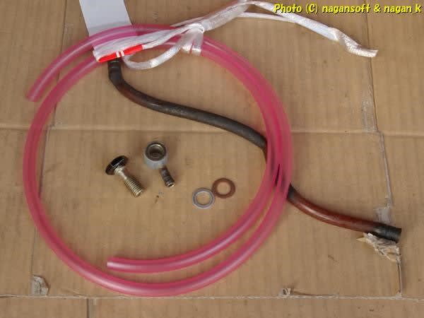 2サイクルオイルの通り道で、エンジンとオイルポンプ間のホースを取り付けます。