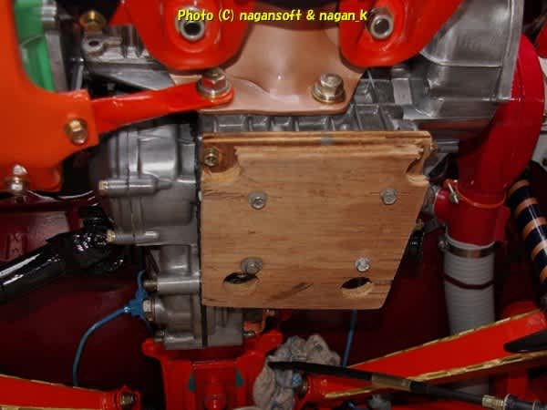 エンジンミッション側は、ジャッキを当てて引きずってもいいように自作板を取り付けたままです。