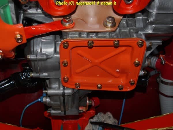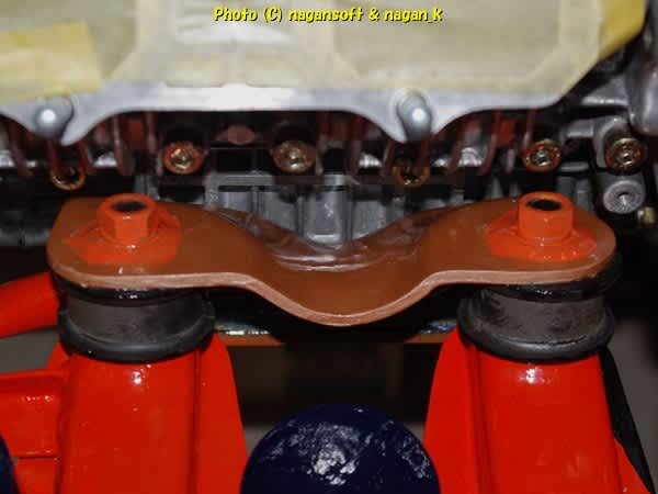 エンジンマウントリヤ側を固定するときに平ワッシャーが入らなかったのでブラケットの塗装が割れました。そこに錆止め塗料を塗ってグレーになったのよね。