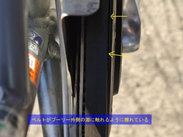 つまりリヤタイヤが微妙な左向きについていた。もちろんリヤタイヤのベルトペーリーも傾いてます。その状態で引っ張るとベルトが外へ外れるように移動するのだが、力を加えたときにプリーの遊び幅が大きいほうがベルトが移動しやすいだろうと考えるとフロントペダル側のベルトがずーっと外向きへ移動したいと擦れていたということになるかと思います。