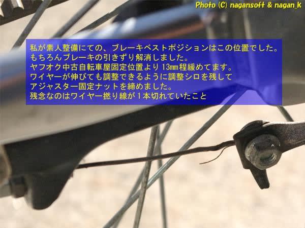 中古自転車屋はアジャスター調整ナットのことをしらないのか、アジャスター部分はそのまんまでワイヤーを無理やりいっぱいに引っ張ったところでワイヤー固定ナットを締め上げてます。それも常にワイヤーにテンションがかかっているからワイヤーが引き抜けたりという経験をしているのかな?ワイヤが引っ張りぬけたらいやだとものすごい力で締め上げているのかと…