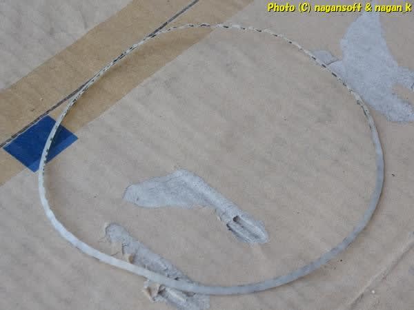 プーリーの縁にあてがってすんなり収まるのであれば再利用(接着かな?)とかも考えたのですが、プーリー径よりあきらかに大きくなってます。つまり伸びてしまってダメダメということです。
