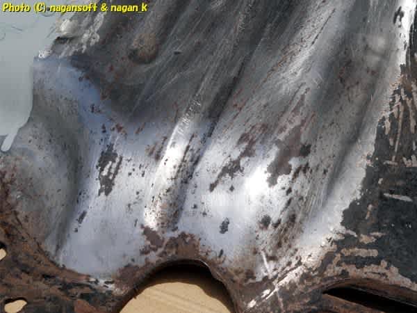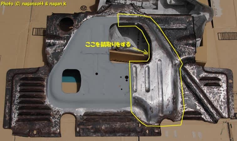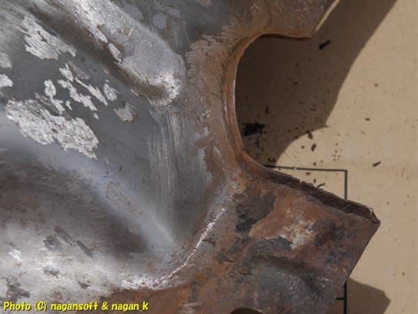 車体外側の鍋底部分で錆取り途中箇所を攻略します。