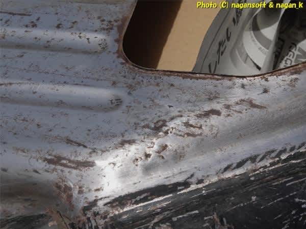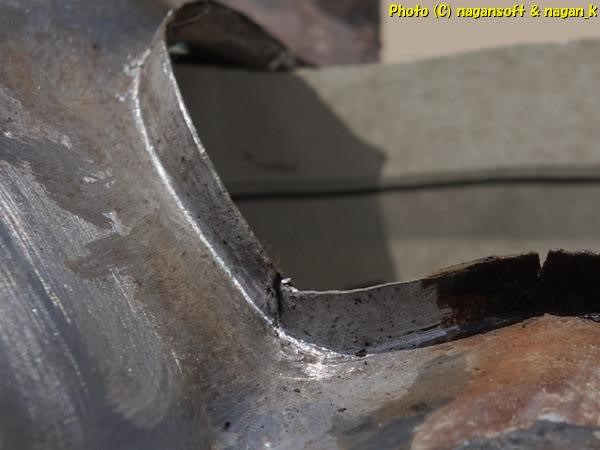 縁のリブ部分が曲がっていたので板金していくと、なんか鉄の感触がおかしい。