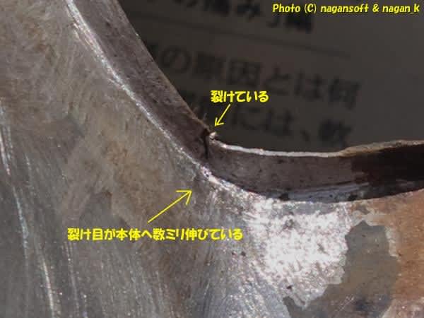 よーく見ると、リブが裂けてます。その裂け目が本体側にまで広がっています。