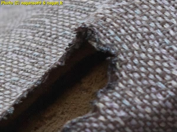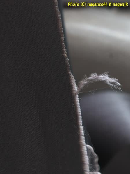 ホツレ糸の細かい髭が気になるなーと、縁を手で外側に引っ張るといくらでも糸が裂けて出来る。