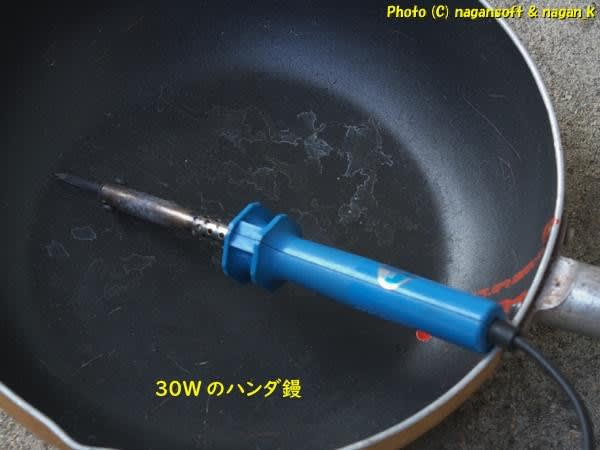 出力の大きいやつを用いて一気に溶けたりすると困るので、ネチネチと鏝で炙り続けてもいい、時間がかかってもいい、安全牌で進めてみようと思い、30Wハンダ鏝でやってみます。