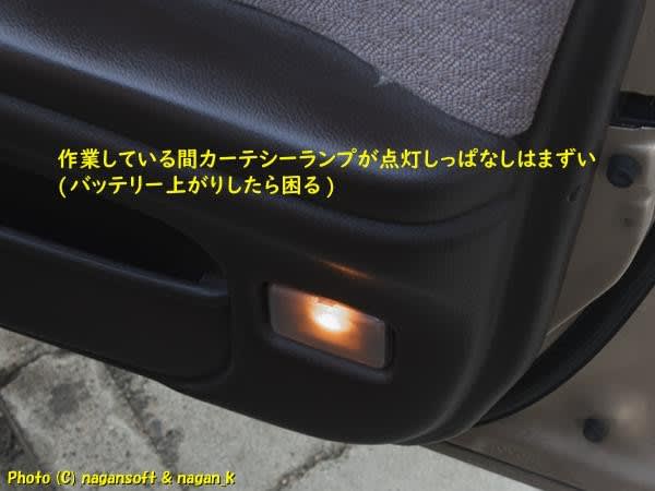 カーテシーランプを点灯しないようにするスイッチってないのよね。作業中にランプ付きっぱなしはバッテリーに対して良くないのよ。