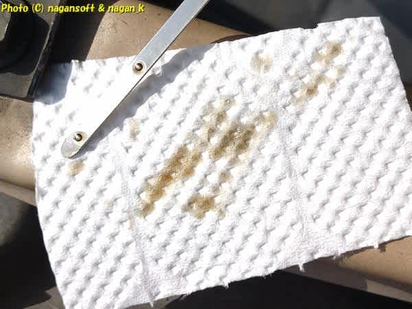 そうそうオイル汚れの確認しときます。って言うてもオイルレベルゲージをキッチンペーパーで拭き取って色を見るだけなんですけど…
