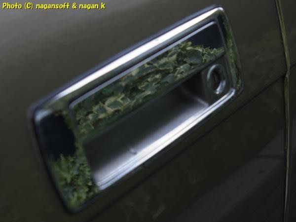 ドアノブ部分です。日常的に触れるところなのでそのメッキ肌は想像できるでしょ。それが、植え込み植物が映り込むくらいまでになりました。