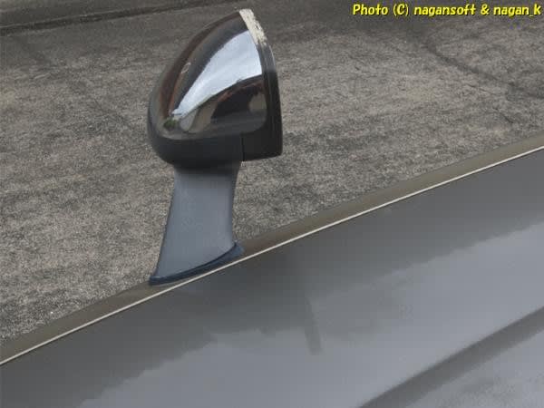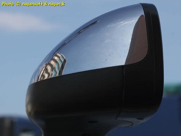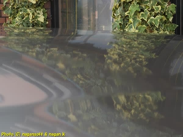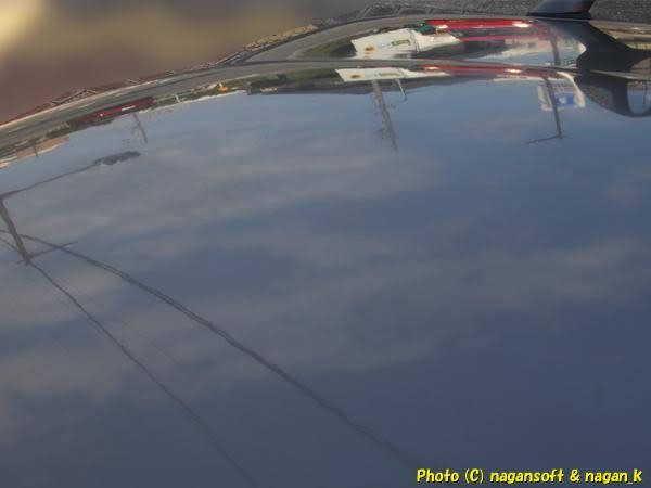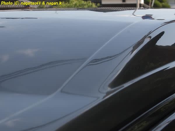 ボンネットにバックミラーが映り込む様子。