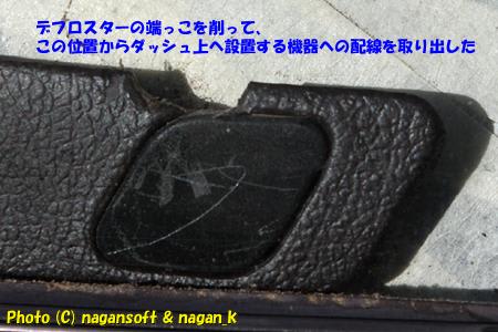 で、デフロスター出口の端っこを半田コテでちょっと焦がしてケーブル取り出し口を作りました。