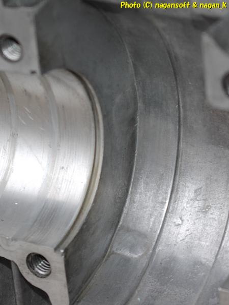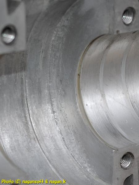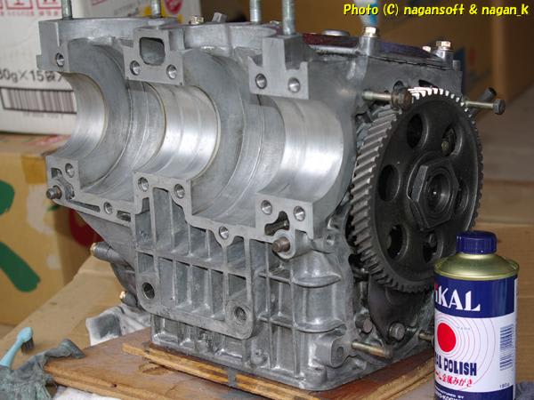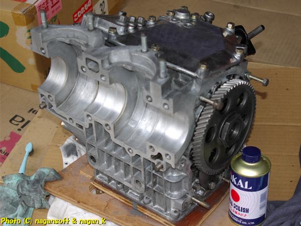 お掃除の手順としては、バリが酷いころは250番のサンドペーパーで研磨。ガスケットシートがあてがわれていた面は800番のサンドペーパーで研磨。クランクシャフトのベアリング表面オイルシール表面があたる部分は研磨しない。もちろんクランクカバーとの擦り合わせ面も研磨しない。残りをピカールで磨くです。
