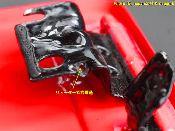 燃料給油口カバーヒンジ部分のPOR-15でけってりと塞いでしまったバネ通し穴を貫通です。