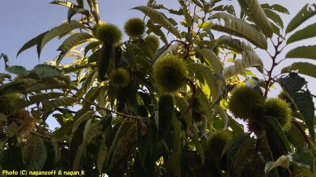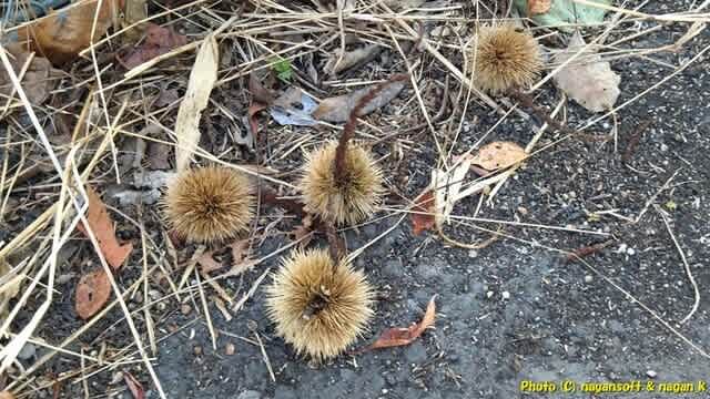 すぐ横のすぐそばの高さにイガグリが垂れていた。手を伸ばせば十分届く高さだよ。