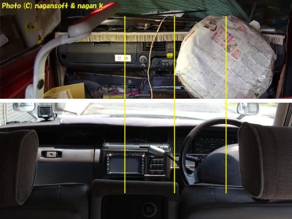 当初は、ラジオとシガライター周辺をごっそりカットして2DINカーナビを埋めようと考えてました。もちろんコンソールパネルの下端をカットすることになります。その延長で下から立ち上がったコンソールパネルと合体と考えてました。