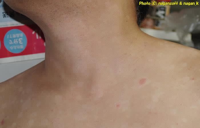 首一帯にあった赤い発疹はかなり収まったのですが、白いモヤモヤが….