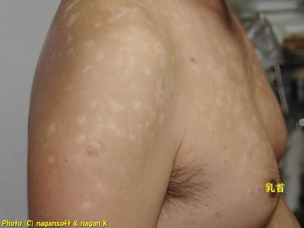胸周りは赤い発疹が酷かったから白抜け部分が繋がって白いモヤモヤになっているんです。