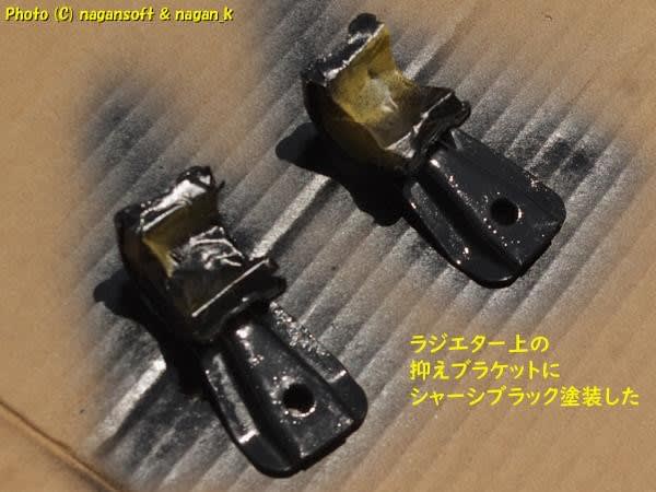 ラジエター上の抑えブラケットをシャーシブラック塗装しました。
