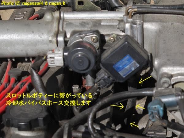 もう一つの交換部品が、スロットルボティーに繋がっている冷却水バイパスホース1本です。