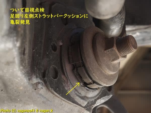 足回り左側ストラットバークッションに亀裂発見。こやつはクラウンブルブル病に起因するやつなので重要経過観察ですな。