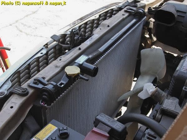 ラジエターにつながっているホースを全部外し、上の固定ブラケットを取り外して、ラジエターを上へ引っこ抜くだけです。ラジエター下側は受けゴムに突起が差し込まれているだけです。