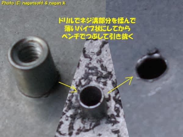 ドリルでネジ溝を揉み込んで薄いパイプ状態にします。それをぺンチで潰して抜き取るのです。