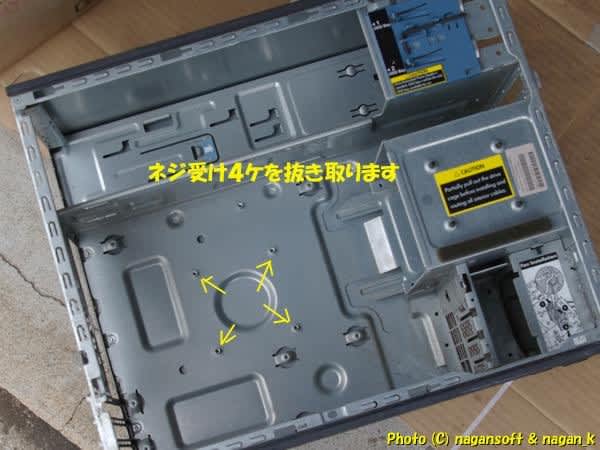 次は、CPUクーラー固定のネジ受けを抜き取ります。このネジ受けがあると汎用のマザーボードを固定できません。