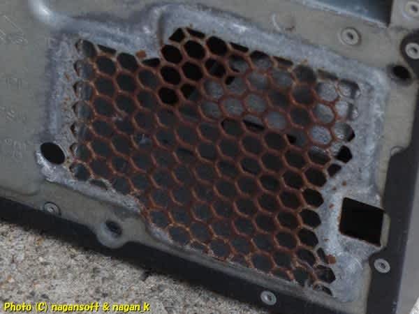 フロント面エア吸い込み口の裏側が袋になっている空間がありまして、そこも相応に錆があります。