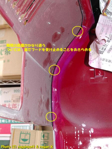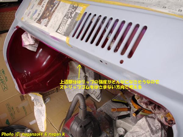 こりゃー、リップにストリップゴムをはめてエンジンルームフードの面を均等に受け止めるのは無理だとあきらめます。