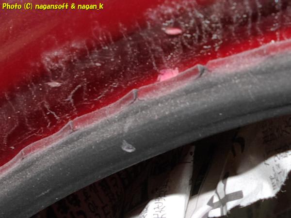 縁に赤色塗料が付いていてその溶剤に負けているのかギャザー仕上げになってます。