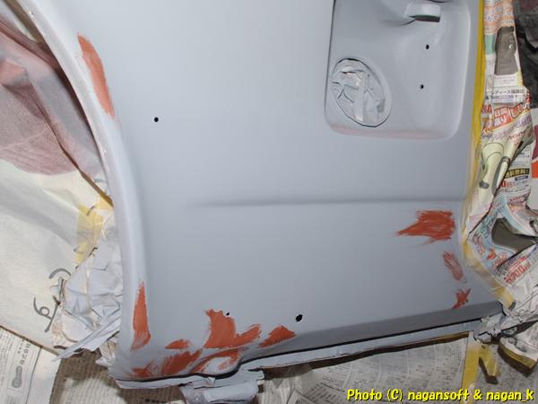 給油口下のサイドシル部分です。ここも気に入らない点がありますので薄付けパテをなすくりました。