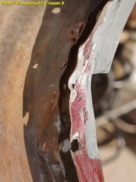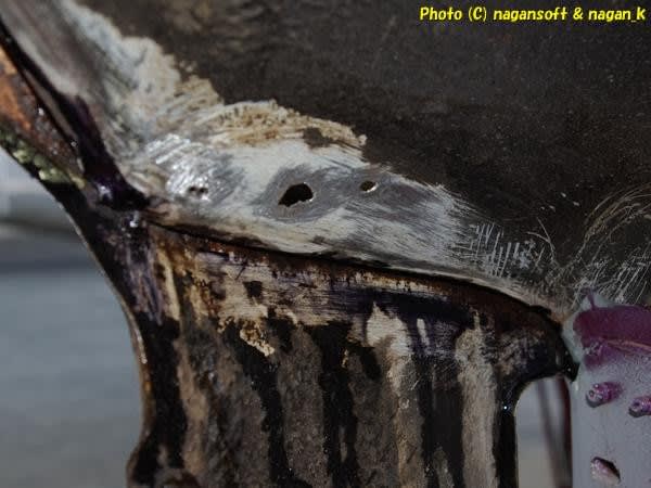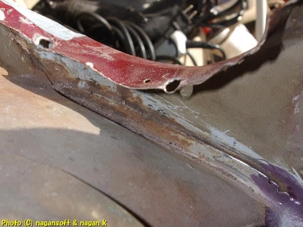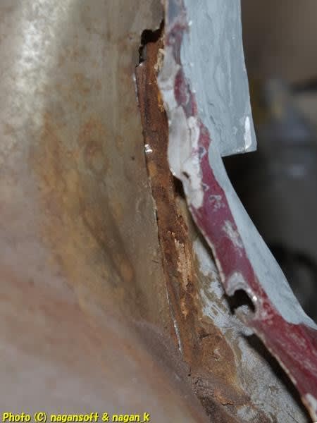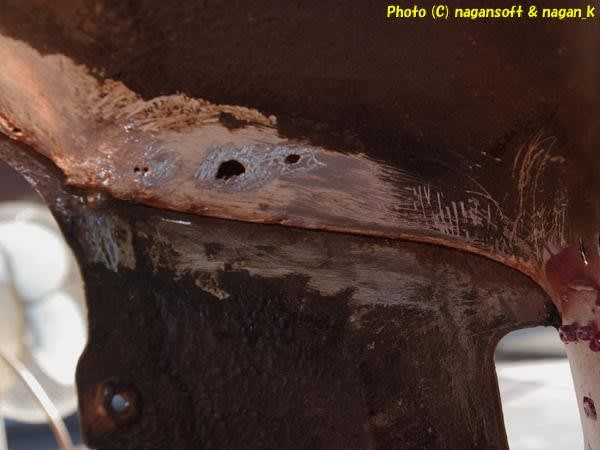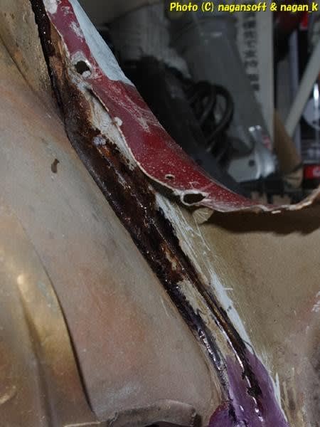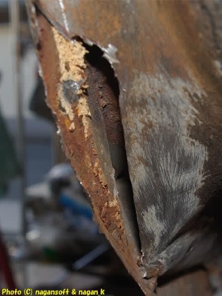 えーい、錆穴がボソボソと出てくる箇所を切り捨ててやれ。合わせ部分に錆が救っているのでそこも切開してめくってやれ。