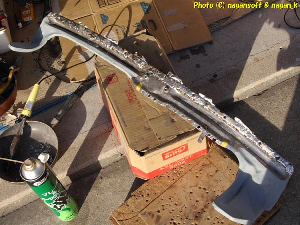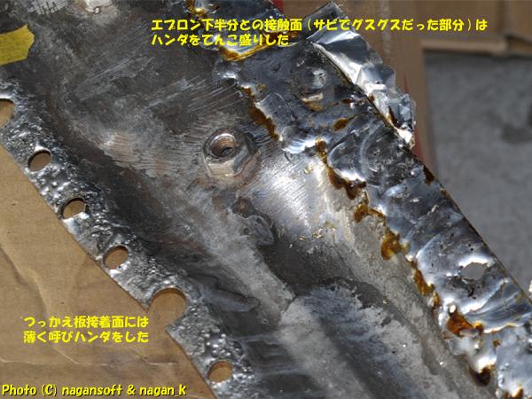 エプロン下半分と接する箇所、つまりハンダをこってりと盛り上げた部分は、余剰ハンダ研磨して面を出してますよ。
